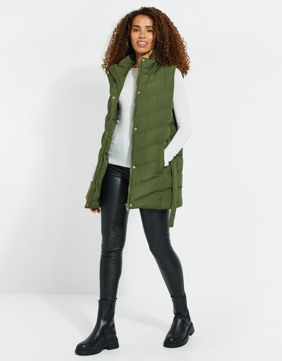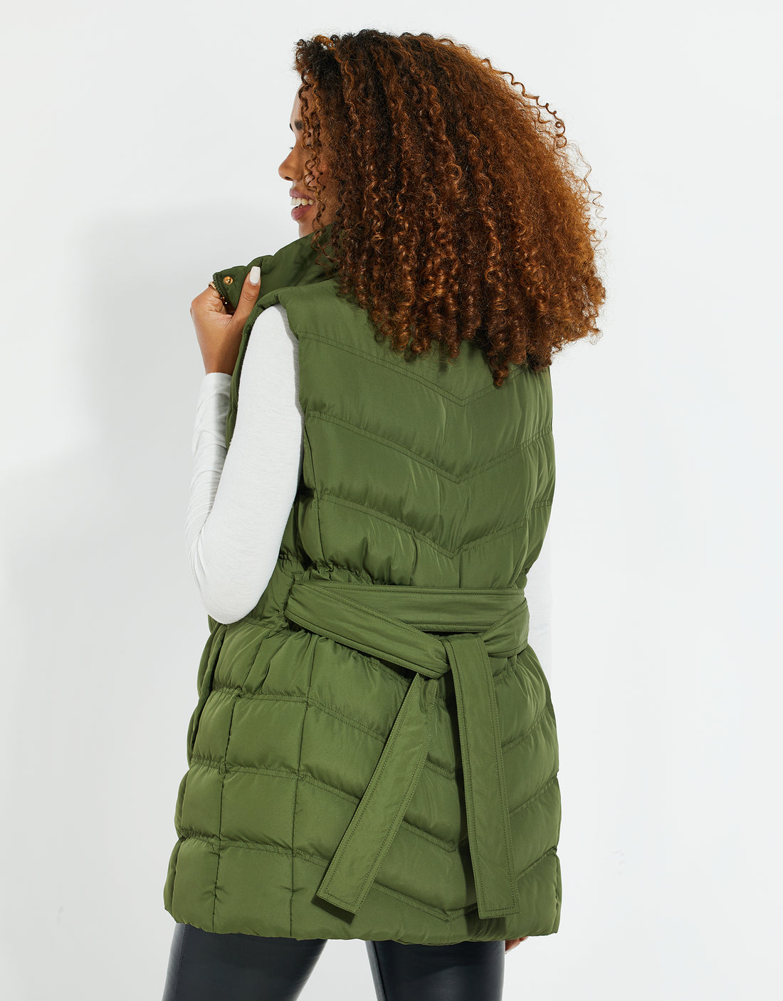 Belt as you wish with self-tie belt and make use of two front pockets to keep the cold off, this sleeveless jacket also has a gorgeous duvet hem and full zip fastening.