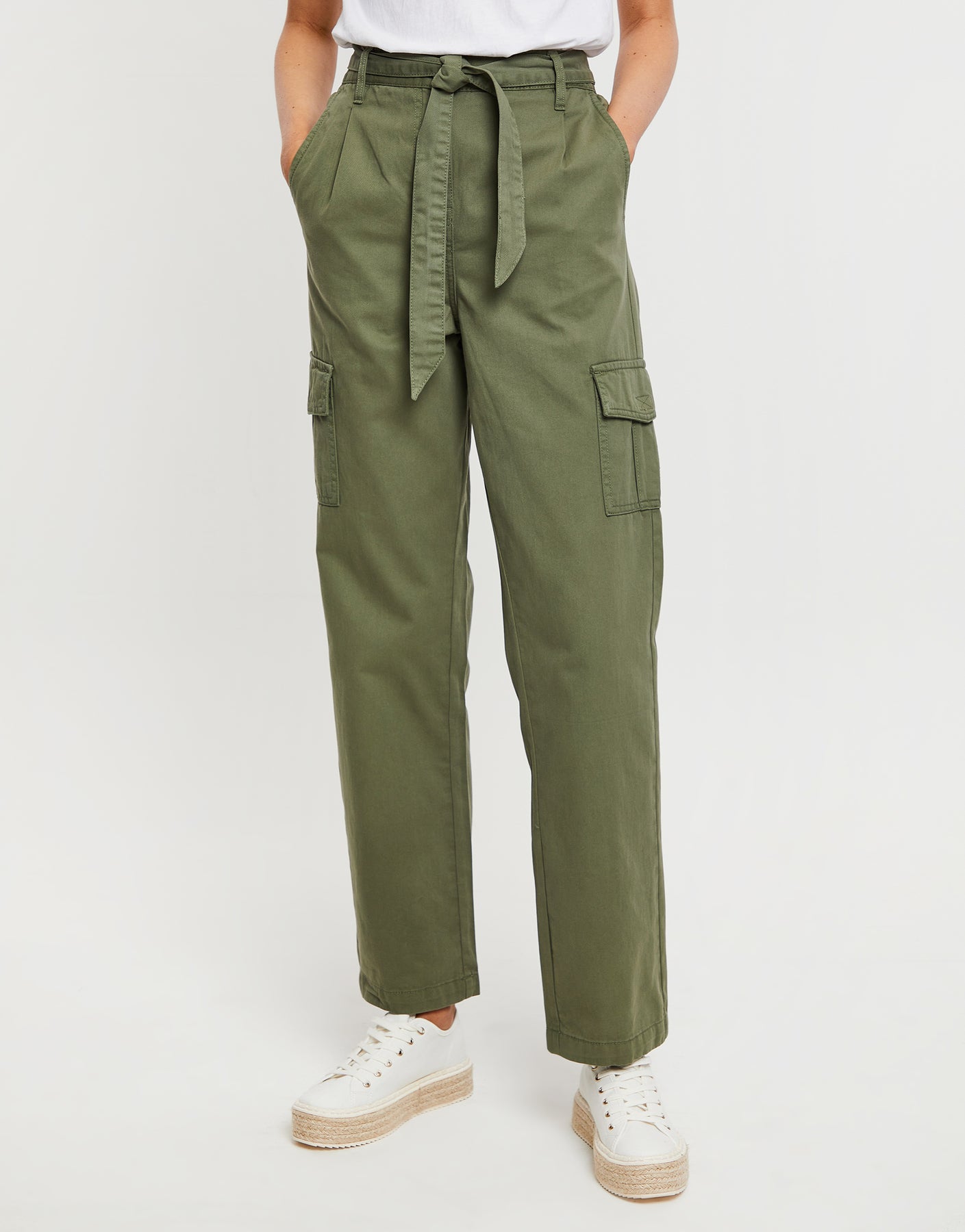 With a folded tie belt, belt loops and metal shank button fastening waistband, they're made from 100% cotton and have cargo style pockets on the side of the legs for that utility detailing.