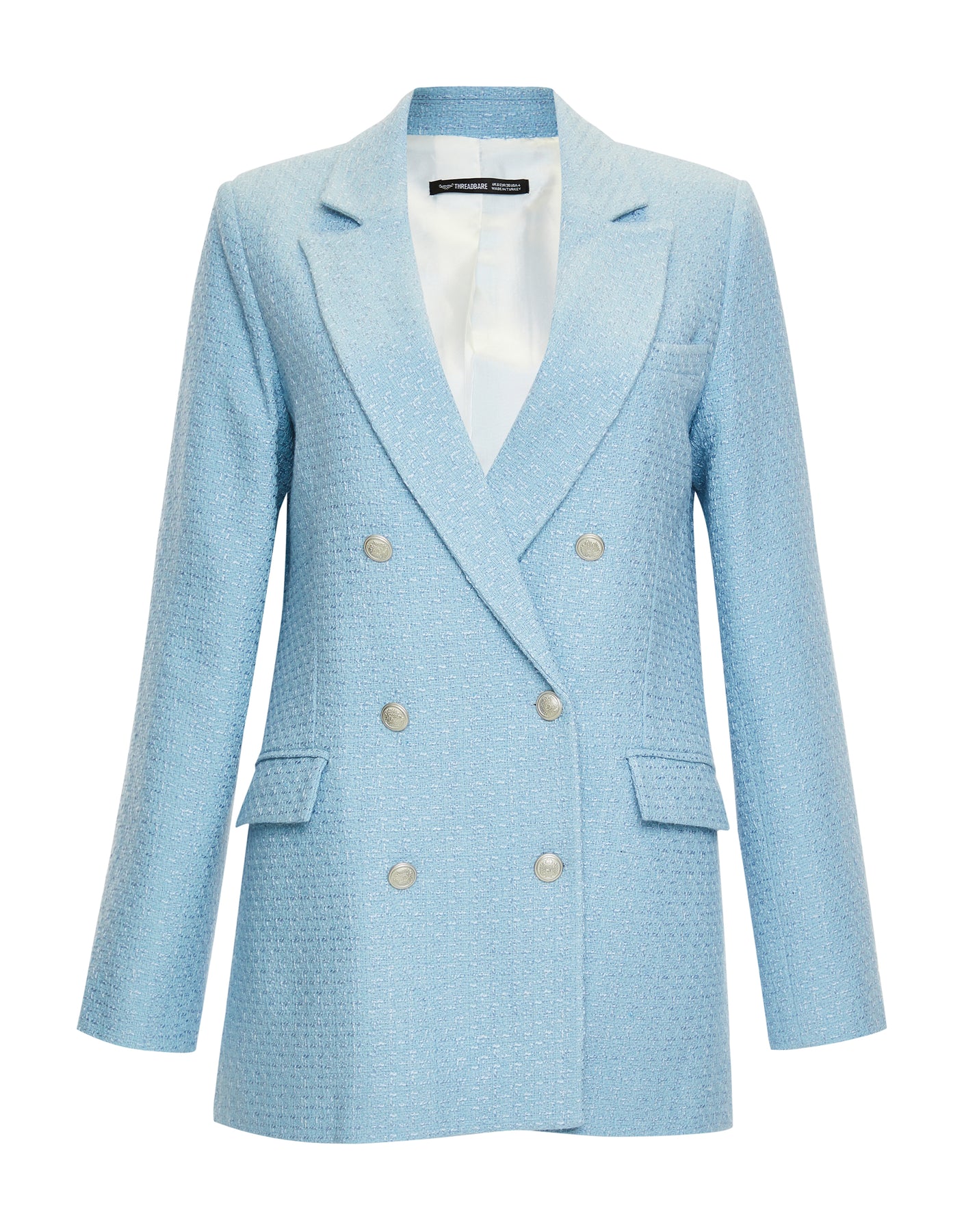 In a woven bouclé fabric that resembles luxe French tweed, this oversized blazer in soft powder blue with flecks of white will add sophistication to any look. With a full white lining, this textured blazer has shoulder padding for added lift and two functional front pockets, finished with a chest pocket.