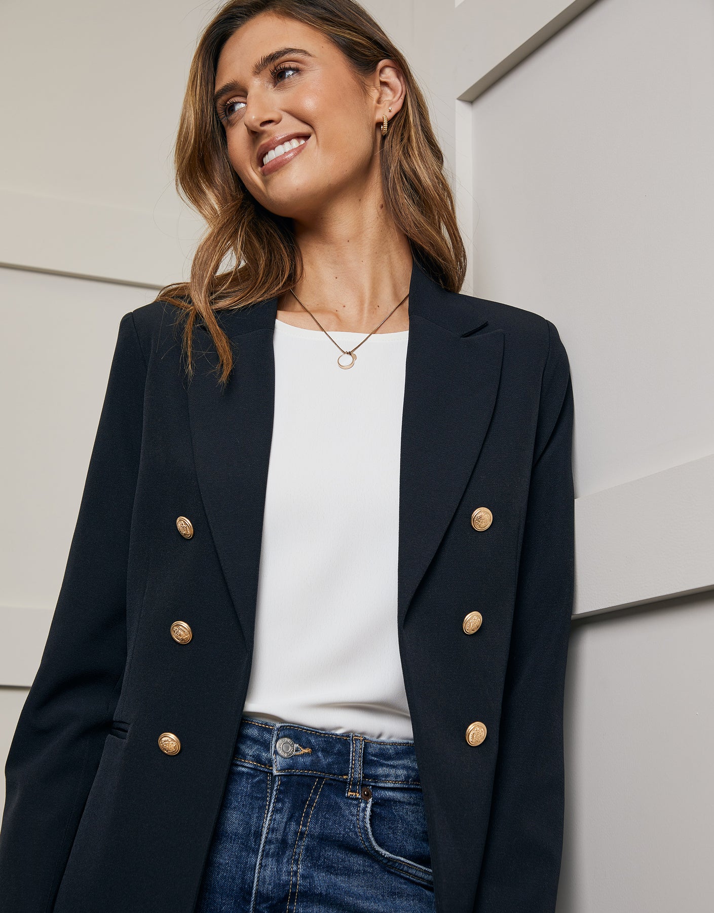 In a sumptuous midnight black, this tailored blazer has a revere collar with a longline lapel, triple military style non-functional decorative buttons, and two hand pockets.