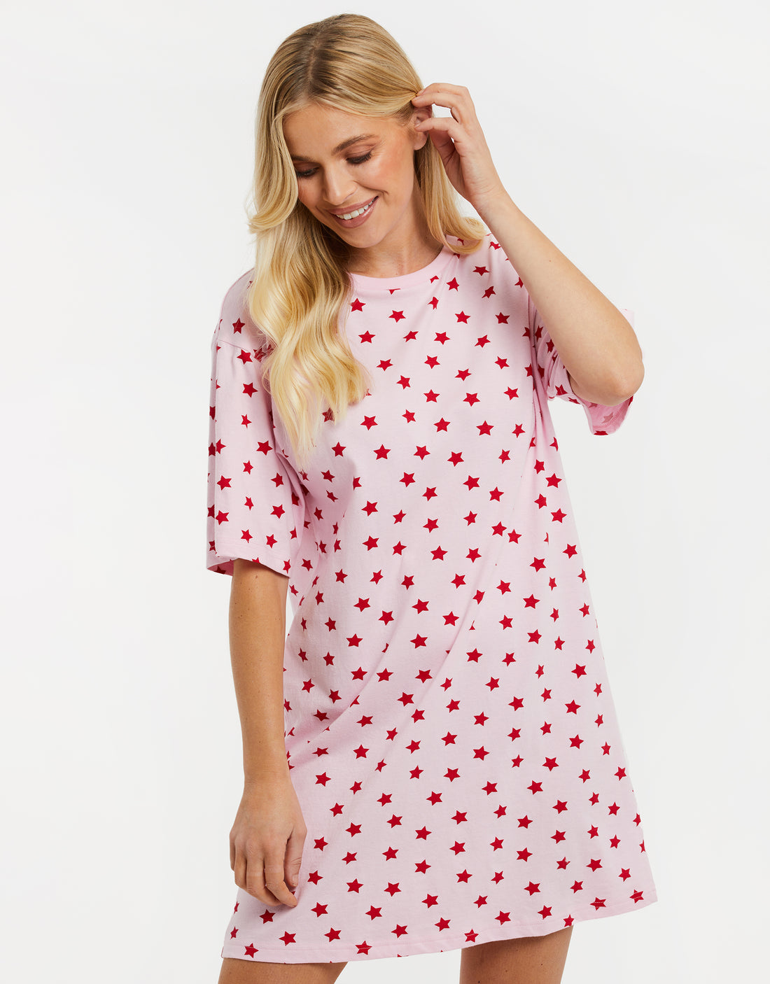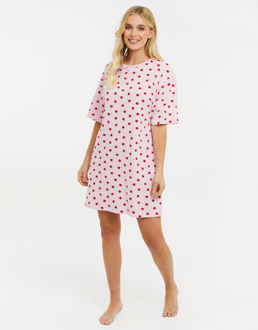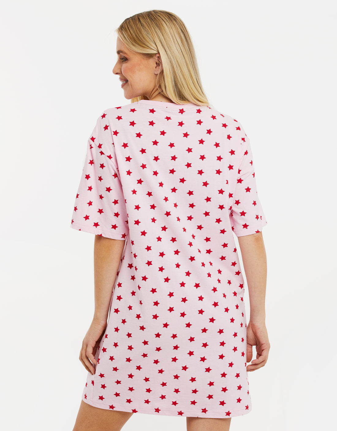 Cosy up in this pink nightie with all-over red star print. In a t-shirt style with round neck and short sleeves, you're sure to sleep soundly. Made from 100% cotton for a comfortable night's sleep.
