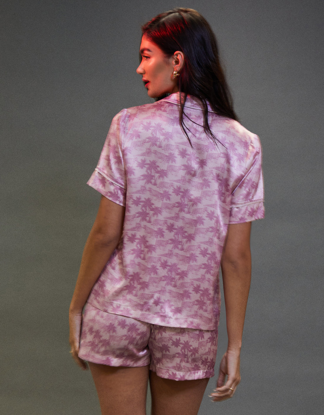 Bring luxury to your nightwear with our pink tiger and palm print satin pyjama set.