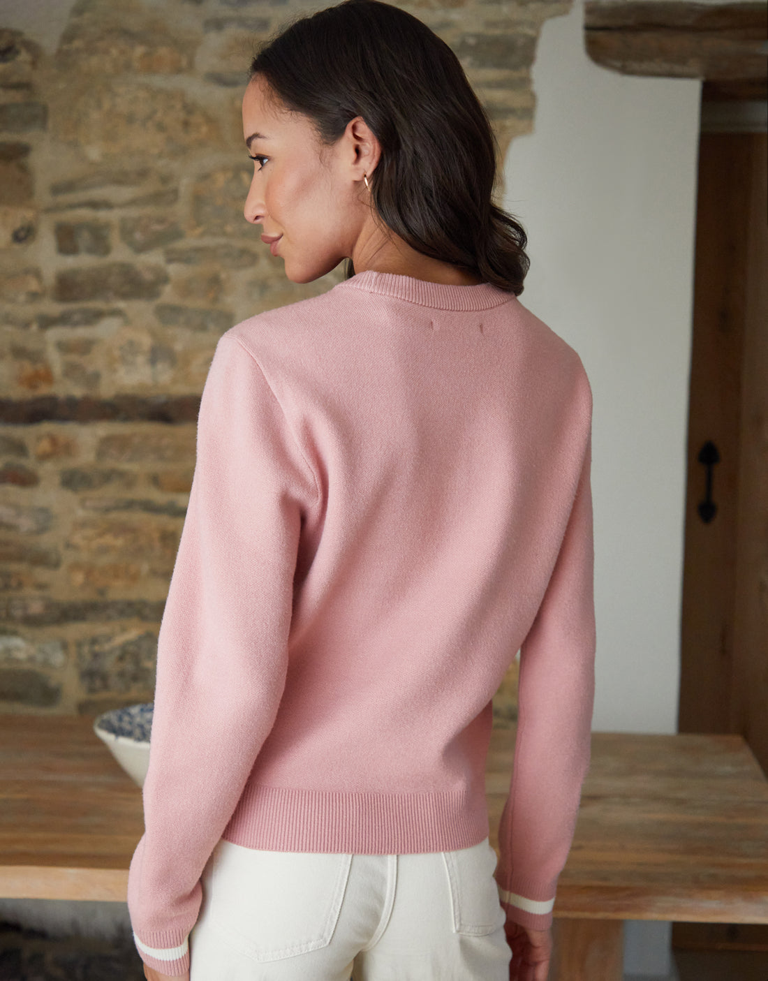 For everyday styling, turn to this knitted varsity pullover jumper for an elevated basic.