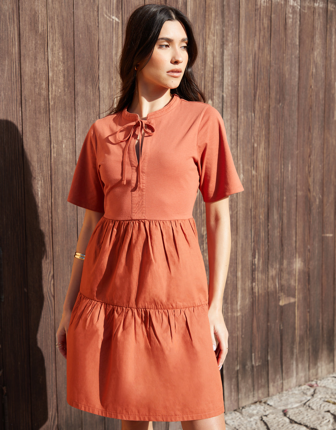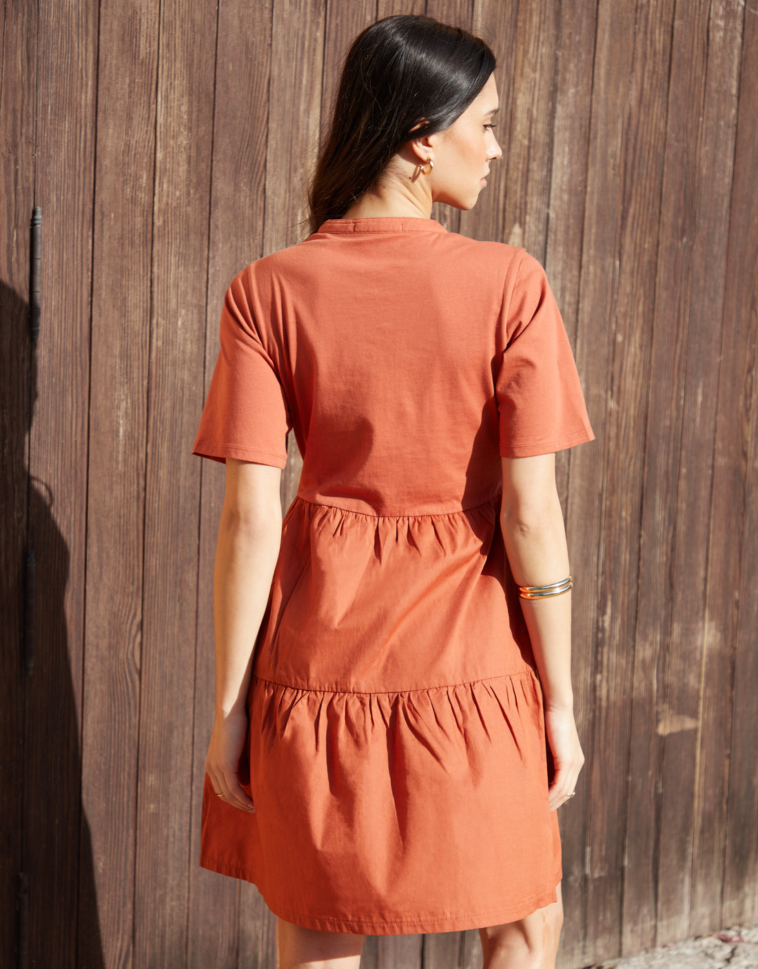 Rust Orange Tiered Jersey Poplin Mix Mini Dress