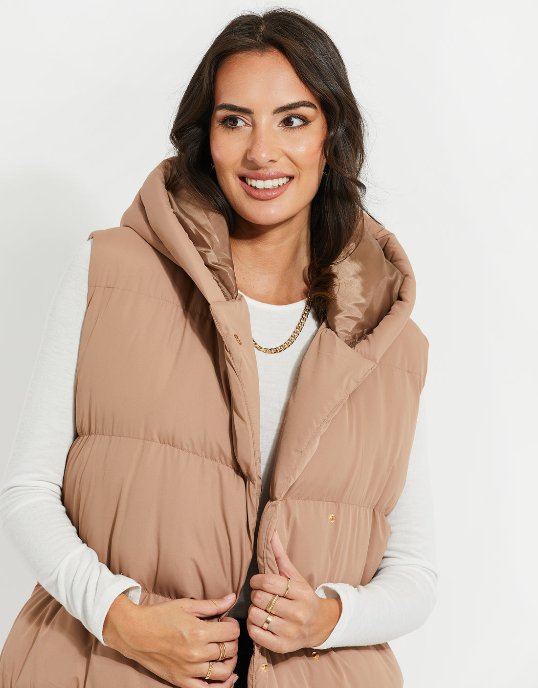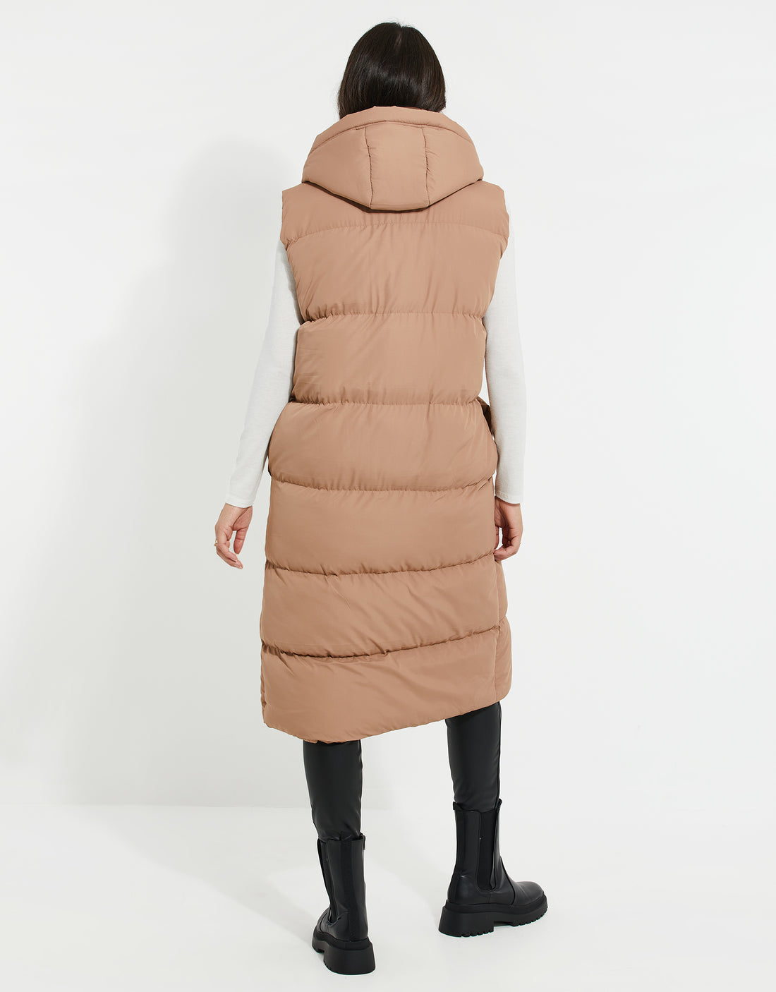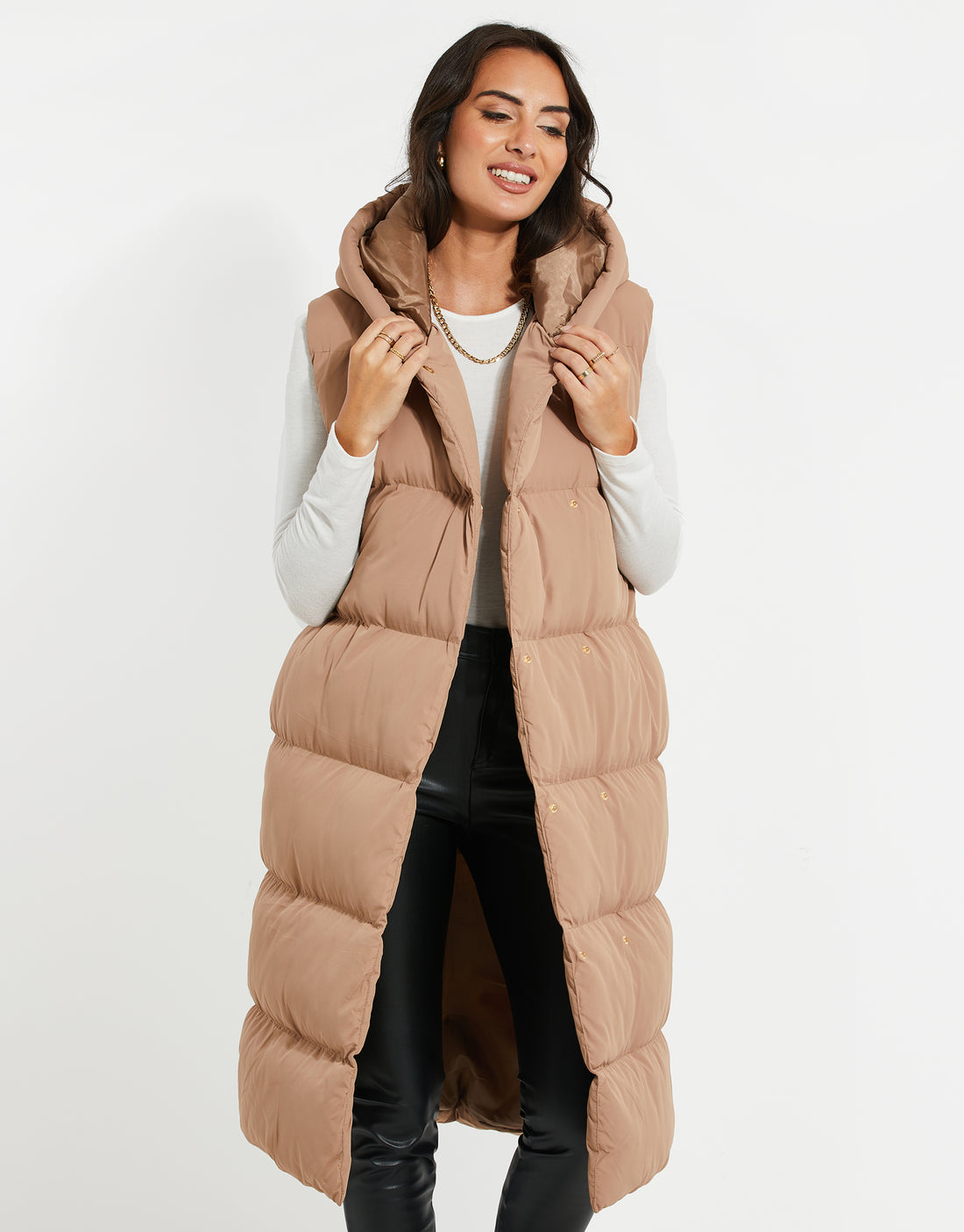 With horizontal seam quilts, this longline wrap style gilet fastens to one side creating a luxe duvet look in an effortless way. Padded hood and duvet hem give off softness, and combined with a double breasted fastening with snap poppers, you're set for a cosy look without the hassle.