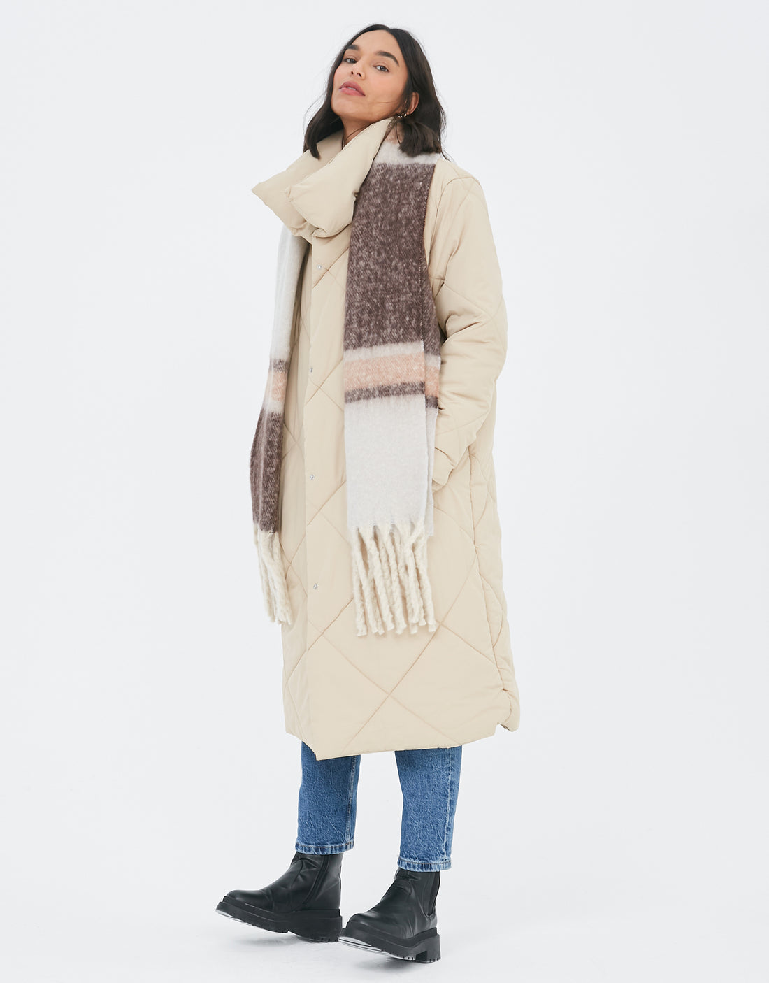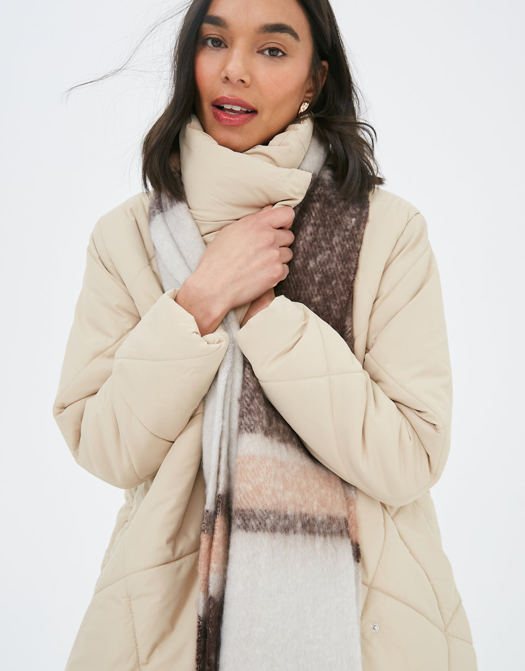 In an oversized wrap style with a large open collar, this longline puffer jacket is a gorgeous option for winter warmth.