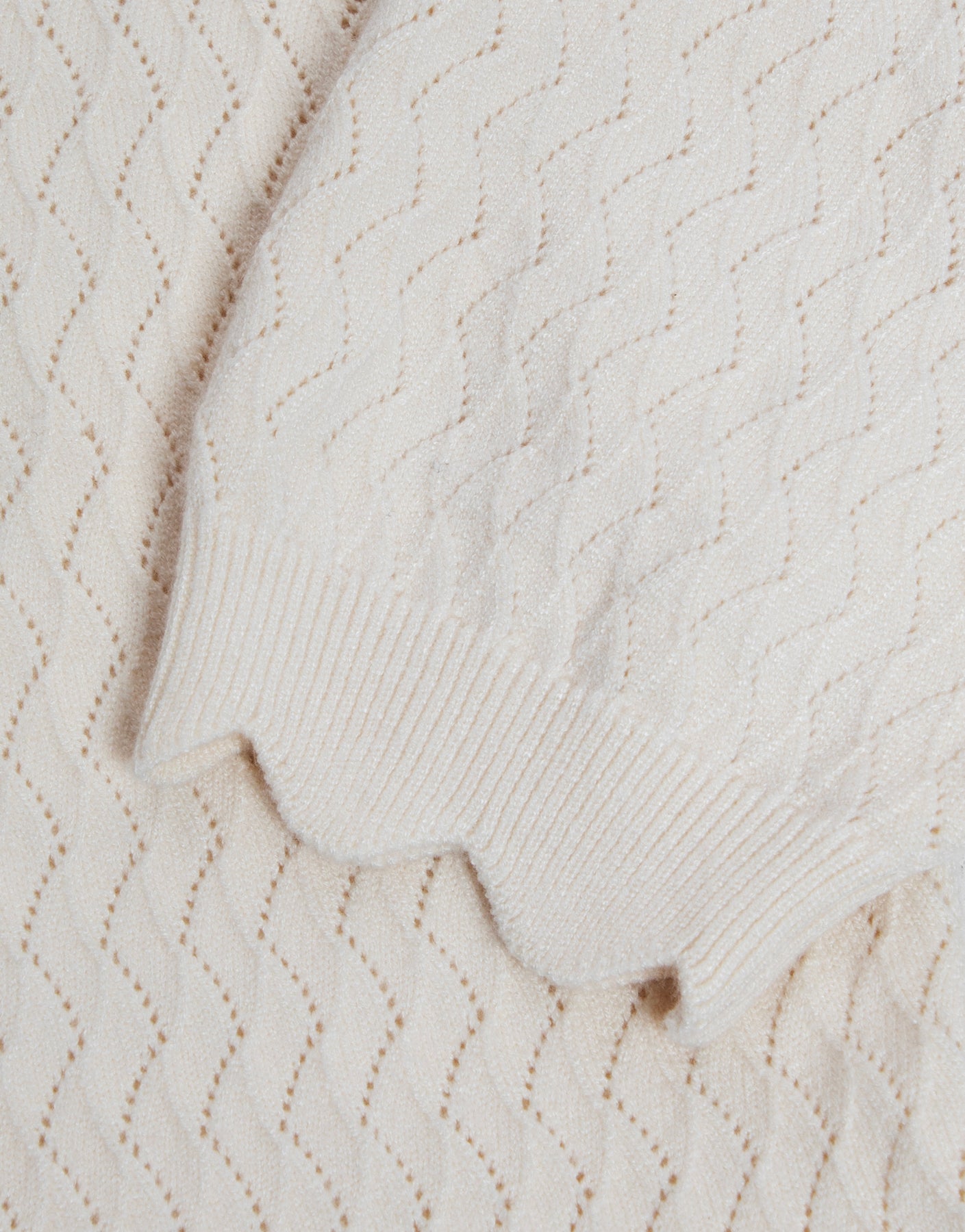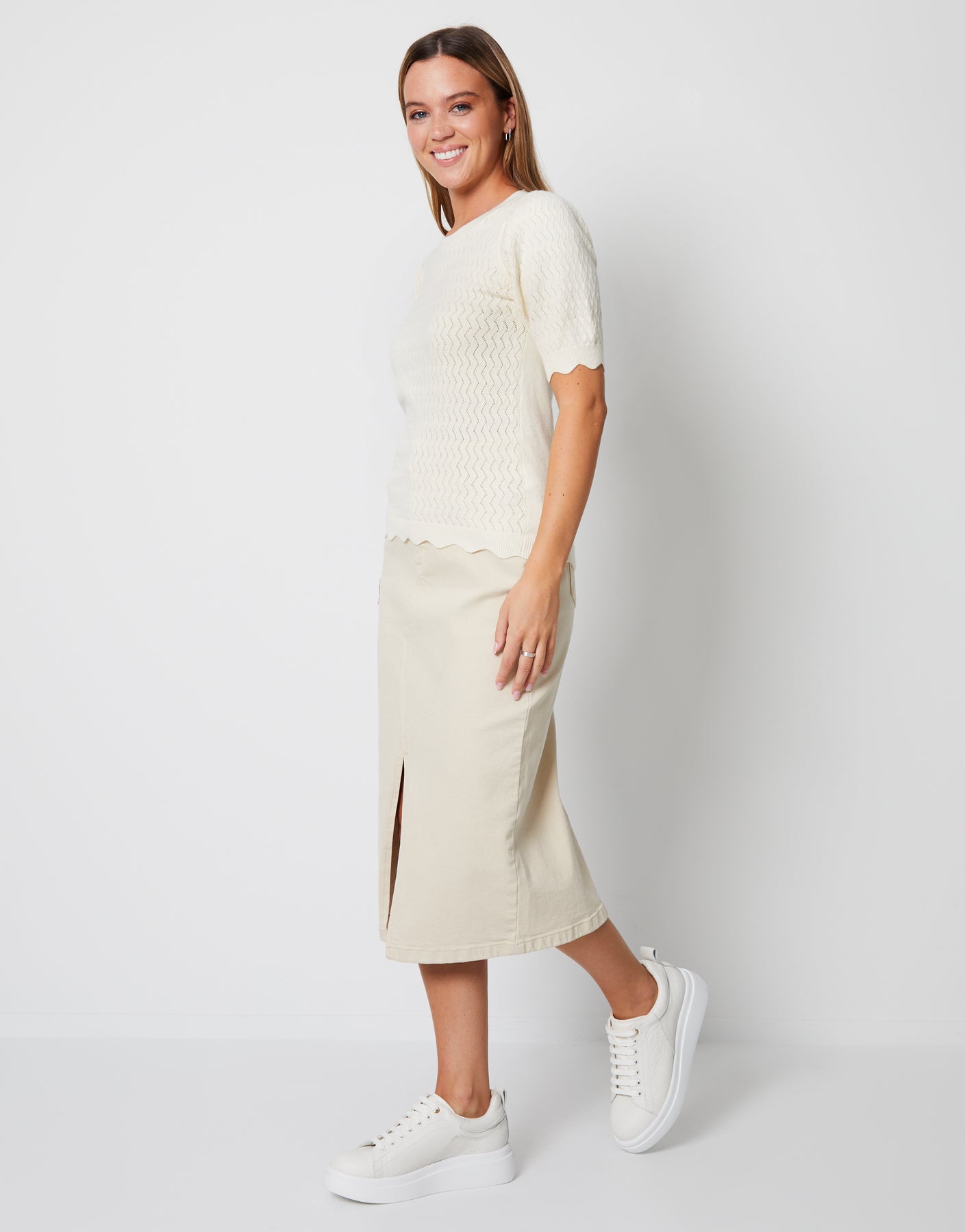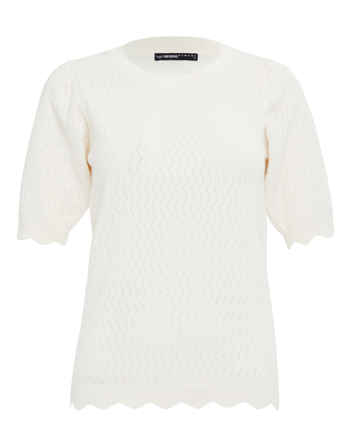 With a pointelle knit to the front and simple jersey knit to the back, this jumper style tee has set in sleeves complete with pretty ribbed scalloped edges, and a round ribbed neckline.