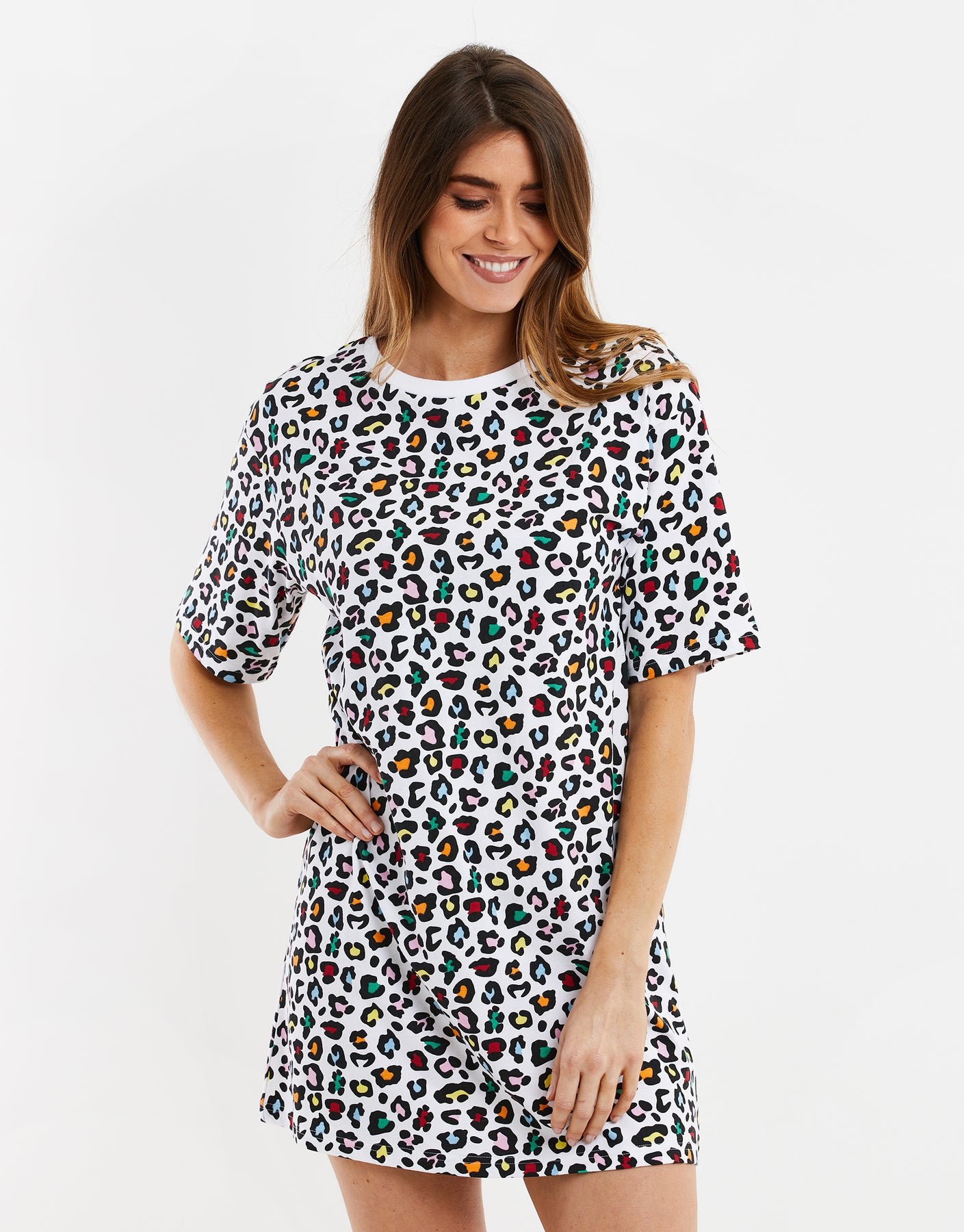 T-shirt style night dress with short sleeves and ribbed round neck.