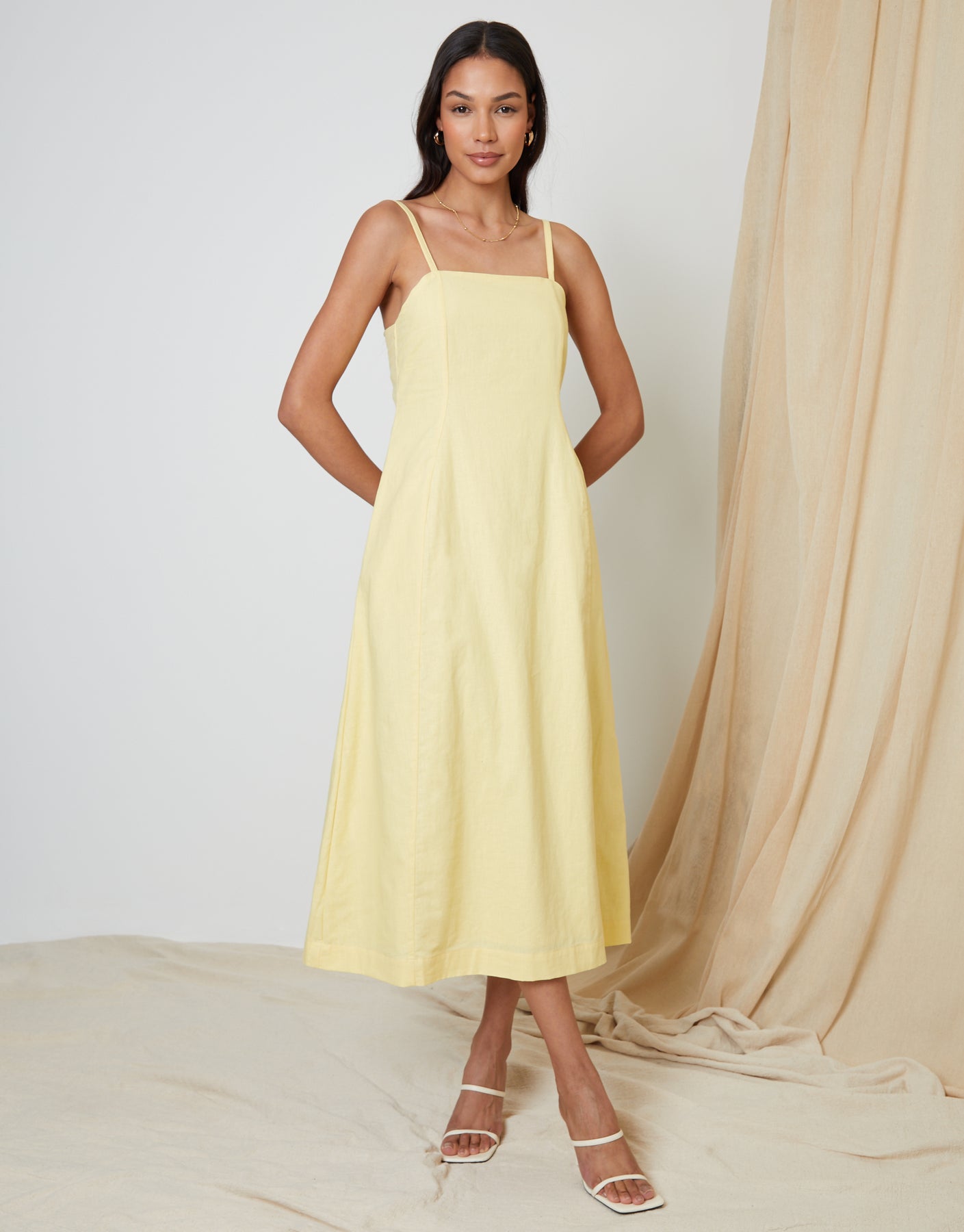 Made from a lightweight linen blend, this dress is in an A-line shape with an elasticated, shirred back panel and princess seams for a flattering silhouette. Cut in a midi length, it features a square neck with removable cami straps for an adjustable fit.