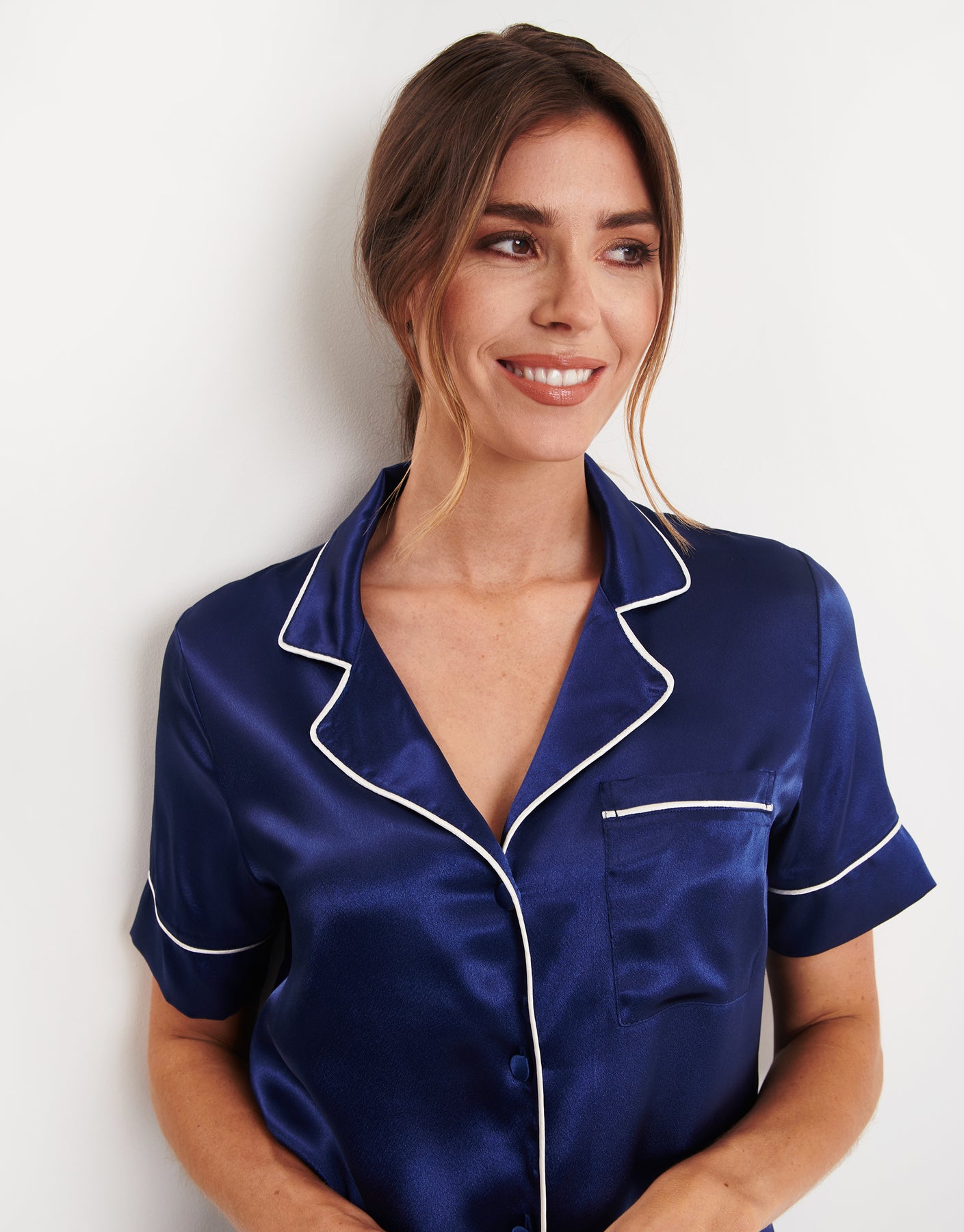 The short sleeve shirt has a soft revere collar, piped in white for a touch of elegance, along with a chest pocket and button down fastening also in navy satin. Matching shorts have an elasticated waistband and satin drawcord.